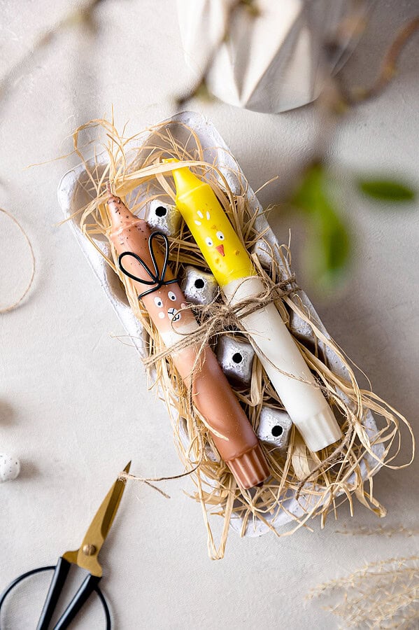 Gefärbte Kerzen sind immer eine schöne Geschenkidee – und diese süßen Osterhasen und Küken ganz besonders.