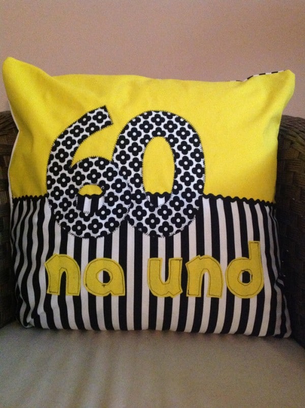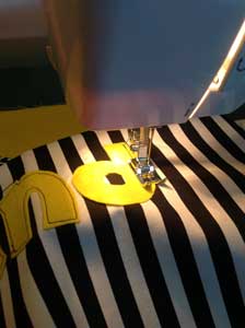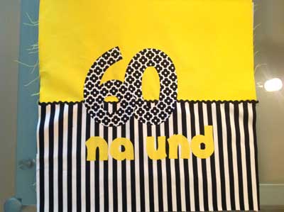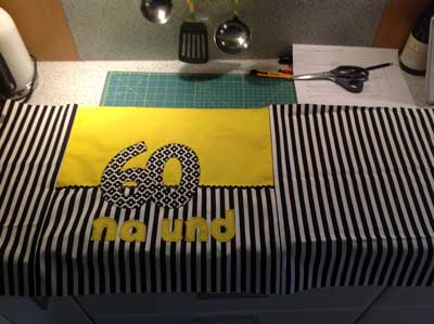 Ich nehme meine beiden zusammengenähten Stoffteile und versehe sie mit einer schwarzen Borte. Danach löse ich die Applikationen vom Vliesofix, lege sie auf dem Vorderteil zurecht und bügle sie auf. Dann werden die Applikationen noch festgenäht – die Zahlen mit Zickzackstich, die Buchstaben mit geradem Stich. Jetzt ist der Vorderteil fertig und kann mit den beiden gestreiften Stoffteilen (50x26cm auf der linken Seite, 50x71cm auf der rechten Seite) zusammengenäht werden.
