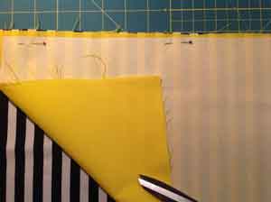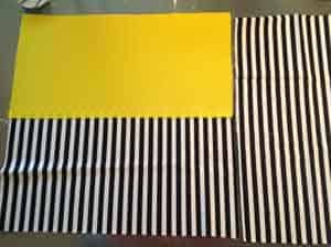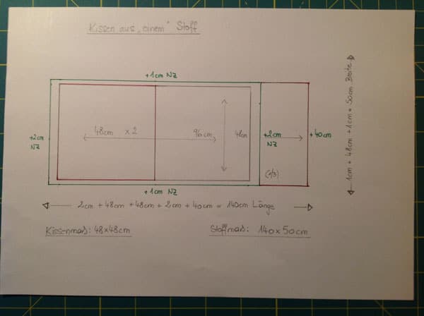Damit ich nun genau weiß wieviel Stoff ich benötige, musste ich mir zunächst einen Schnitt zeichnen. Diese 1. Schnittanleitung ist dafür gedacht, wenn du das Kissen aus nur „einem“ Stoff nähen möchtest (Foto 2). Möchtest du „mein“ Modell nachnähen, dann hab ich dafür auch einen gezeichnet – Foto 3 – (schaut vielleicht etwas kompliziert aus – hab dir aber im Anschluss eine einfache Zusammenfassung geschrieben – alle Stoffmaße sind bereits mit Nahtzugabe (NZ) berechnet). Die folgende Anleitung ist Schritt für Schritt für dieses gelb/gestreifte Modell.