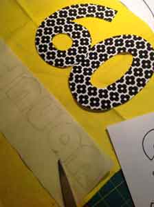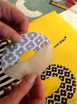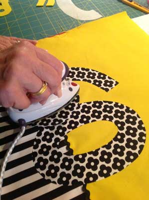 Wenn alle Stoffteile ausgeschnitten sind, beginne ich zunächst die „Vorderseite“ also die Schöne zu gestalten. Dazu nähe ich den gestreiften und den gelben (mit Vlieseline verstärkten) Stoffteil mit den Maßen 50x26cm zusammen. Nun bastle ich mir die Zahlen- und Buchstabenapplikationen. Dafür benötige ich Vliesofix (klebt auf beiden Seiten) und natürlich Schablonen. Ich habe mir die Buchstaben und Zahlen aufgemalt (kann man auch im Internet finden) und dann auf Vliesofix abgepaust. Achtung: immer spiegelverkehrt übertragen – da ansonsten die Buchstaben oder Zahlen am Stoff verkehrt drauf sind!! So nun sind die Applikationen fertig.