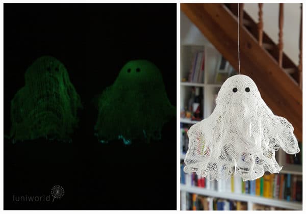 Diese kleinen, niedlichen Geister hier eignen sich hervorragend als tolle Halloween-Deko. Sie lassen sich mit einem Käsetuch und Wäschestärke super einfach herstellen.