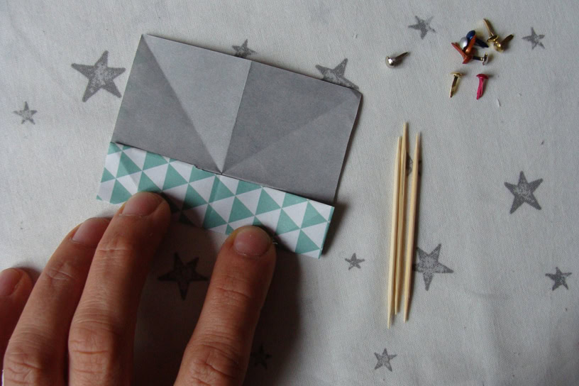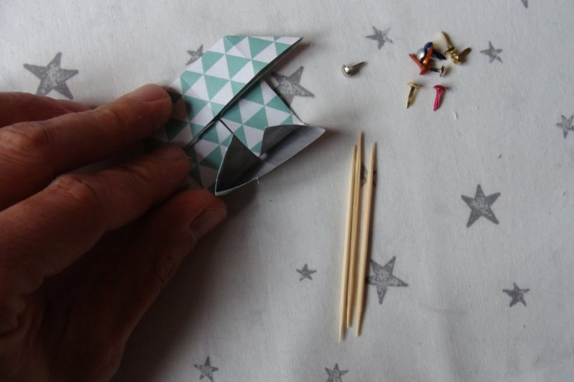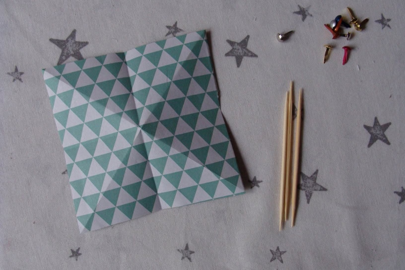 Dafür braucht ihr ein Blatt schönes Origamipapier in der Größe 7,5×7,5cm, einen Zahnstocher, eine kleine Metallklemme und ein bisschen Leim.