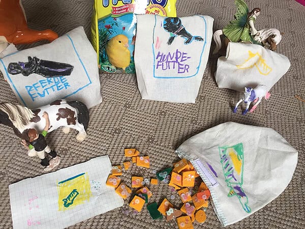 Wir haben kleine Säckchen aus heller Baumwolle genäht. Wir brauchten Futttersäcke für Hunde- und Pferdefutter. Und für die haben wir auch noch passendes Tierfutter gebastelt.