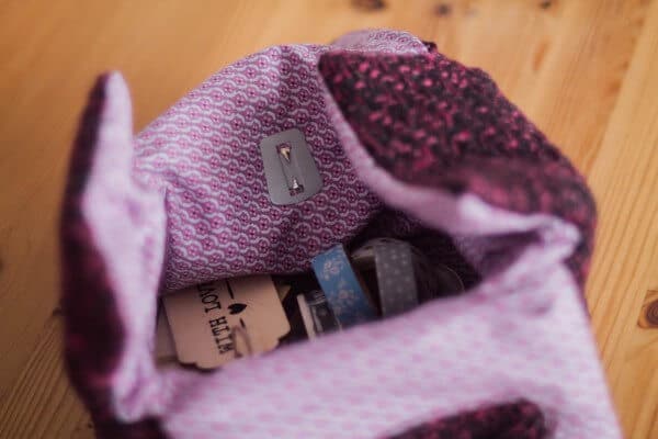 Als ich die „Anni“ im Heft entdeckt habe, stand für mich fest: meine Anni muss mindestens genauso fluffig werden, wie die abgebildete Tasche aus dem Stoff „Gela“ von Swafing. Kurzum habe ich mir meinen momentanen Lieblingsstoff rausgesucht (einen richtig tollen grobstrick Bouclé in Schwarz & Beere) und habe ihm ein Blumenpendant für Innen verpasst. Zusätzlich habe ich die Tasche mit Volumenvlies verstärkt.