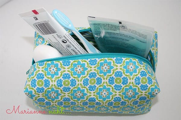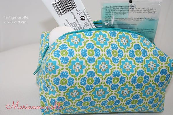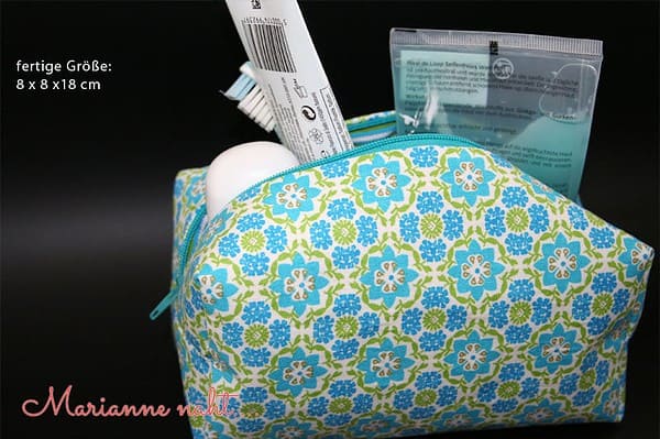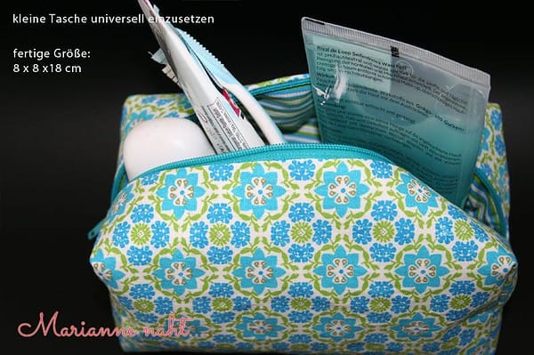 In meinen Fotos habe ich sie mal mit Bad-Artikel bestückt, damit man auch dieses mal sehen kann. Den Schnitt für diese Tasche habe ich aus dem Buch „Tolle Taschen selbst genäht“.