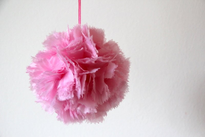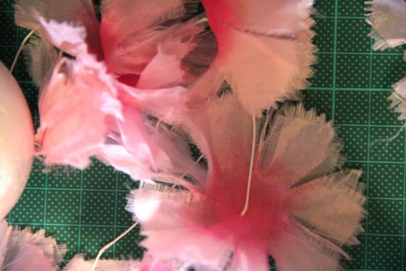 Eine übrig gebliebene Blumenkette habe ich für diese Christbaumkugel verarbeitet. Sie stammte aus diesem Projekt http://neuerstoff.knobz.de/?p=709 und war mir immer zu schade zum Wegschmeißen. Die Herstellung ist wirklich leicht, man kann die Kugel auch gut zusammen mit Kindern herstellen. Meine Töchter haben mir mit Begeisterung geholfen die Blüten aufzustecken und fanden die Kugel ganz muscheligkuschelig.