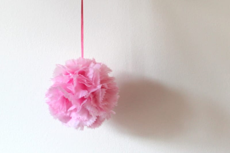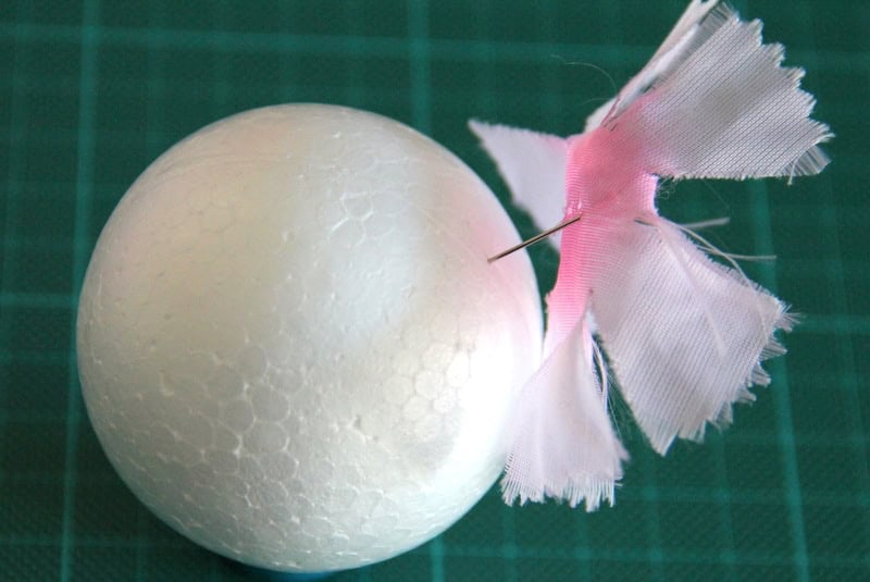 Such dir ein passendes Band aus und befestige es ebenfalls mit einer Stecknadel an der Kugel.