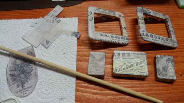 Jetzt baut ihr ( oder lasst ) die Lichtschalterblenden kpl. mit Rahmen ab. Dann schnibbelt ihr das Decoupage-Papier zurecht, so dass es immer mit über den Rand herum geklebt werden kann. Jeweils Stück für Stück pinselt ihr die Schalterblenden und Rahmen mit dem Kleber ein und setzt das Papier drauf. Dann mit dem Pinsel drüber streichen, zum glätten und um es um die Ecken zu verstreichen. Laßt es trocknen und zum Schluss streicht ihr noch mit Klarlack über alles drüber, dann ist es vor Verschmutzungen und Abrieb geschützt.