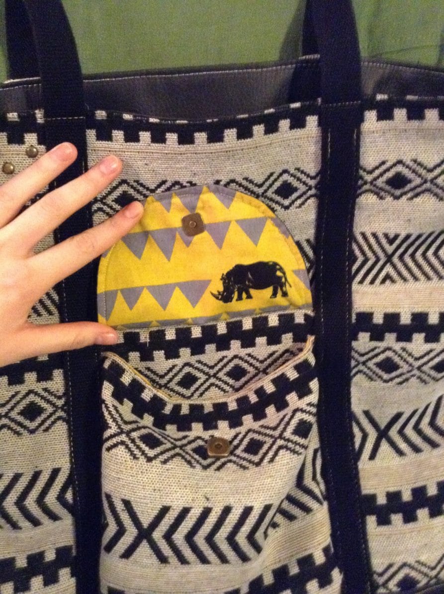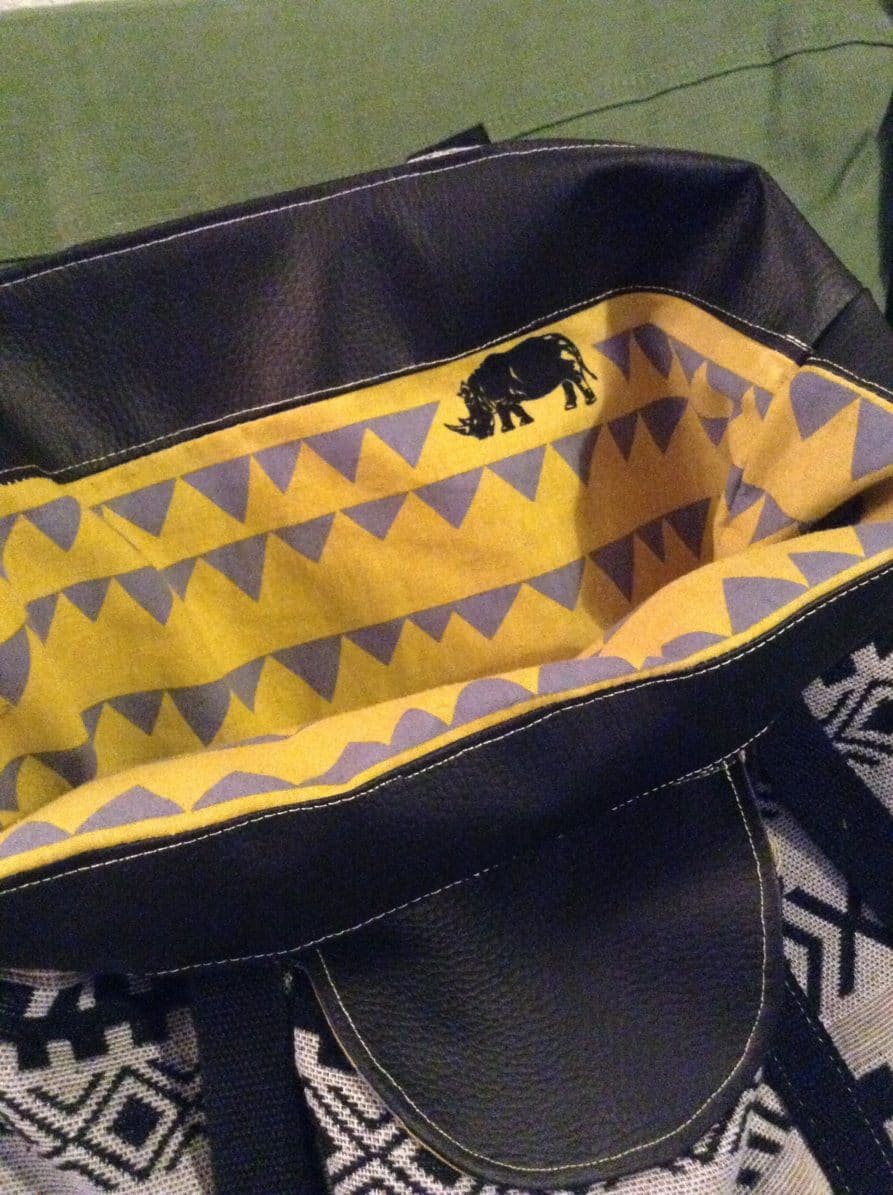 Darum das tolle Innenfutter in Senfgelb mit grauen Dreiecken und schwarzen Nashörnern (!) Das findet man in keinem Laden – nur im Stoffladen ;)