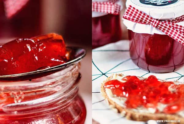 ⑥ Im Idealfall füllt ihr das Gellee anschließend in ausgekochte Gläser und stellt sie nach dem Befüllen für 5 Minuten auf den Kopf, damit erzeugt ihr einen Unterdruck im Glas, so dass es beim Öffnen dieses „Klonk“-Geräusch gibt.