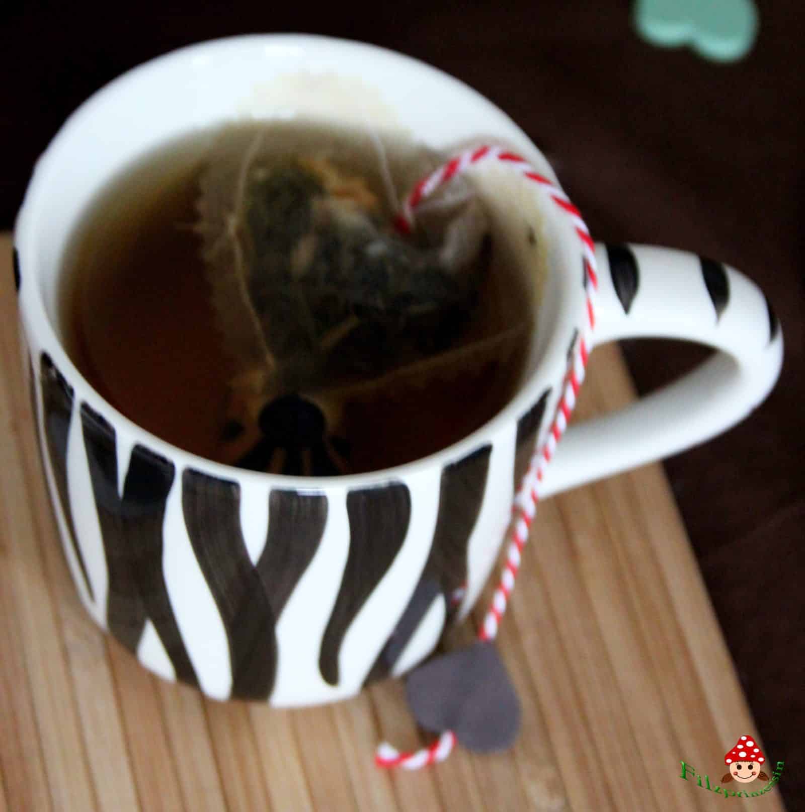 Wenn ihr einen Beutel mit Faden haben wollt, platziert diesen vor dem Schließen der Naht zwischen den Herzbögen und vernäht ihn. Ich lasse meine Teebeutel gern in der Tasse und benötige das nicht immer. Das Garn kann noch mit kleinen Herzen verziert werden.