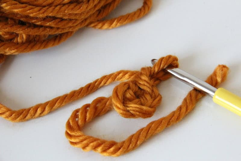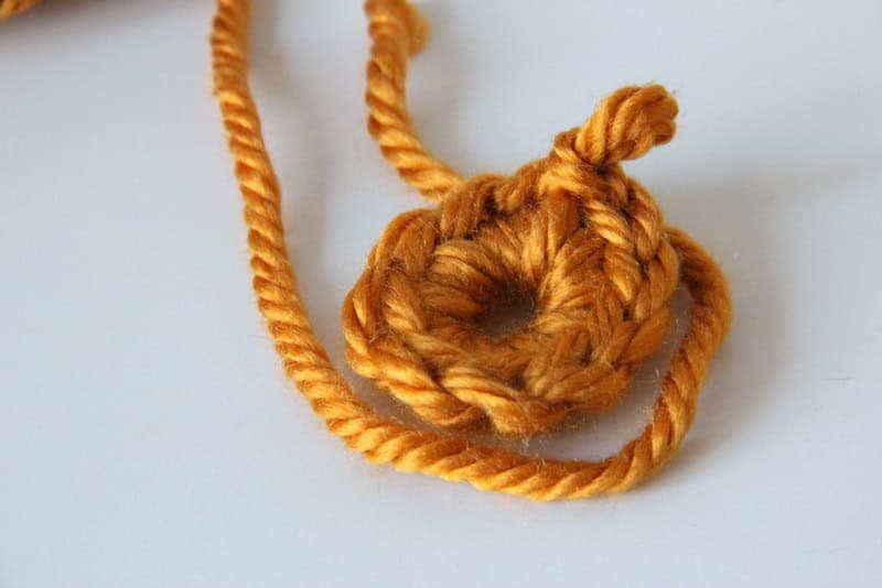 Nehmt euch dickes Garn und eine passende Häkelnadel. Häkelt 4 Luftmaschen und schließt sie mit einer Kettmasche zum Ring.