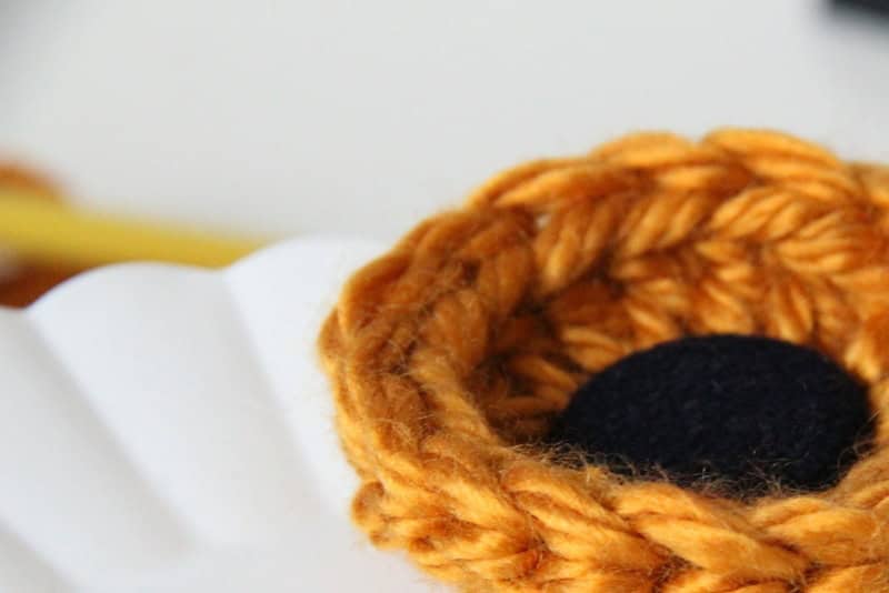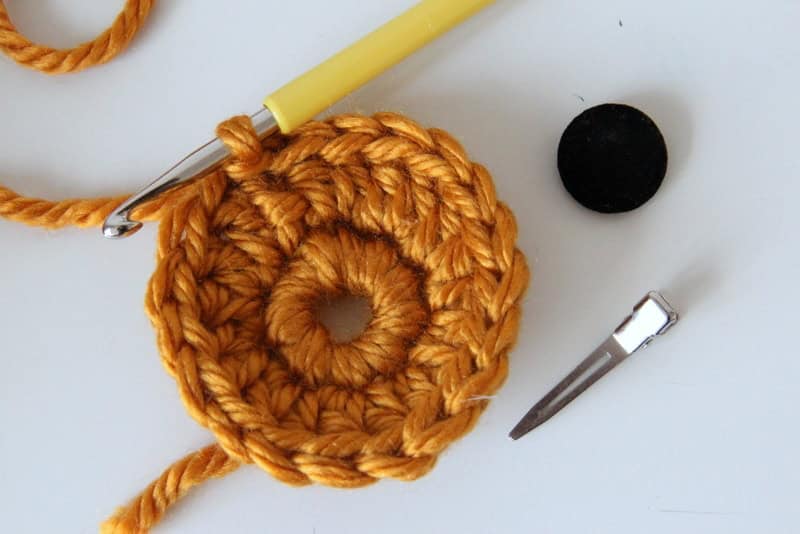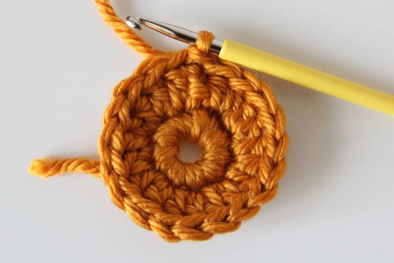Häkelt in jede feste Masche der Vorrunde zwei Stäbchen und schließt die Runde wieder mit einer Kettmasche. Den Faden abschneiden und auf die Rückseite ziehen, schon ist der gehäkelte Kreis fertig.