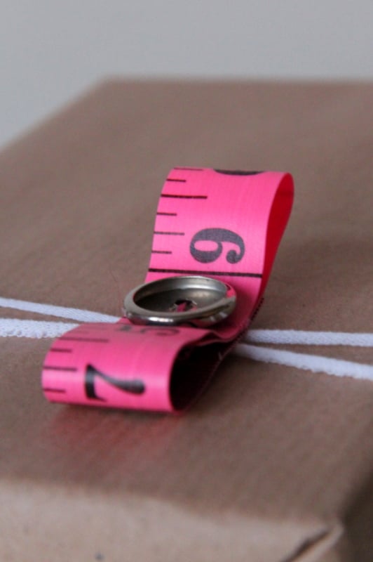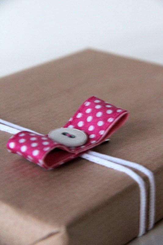 Jetzt pack dein Geschenk in passendes Papier ein - ich liebe einfaches Packpapier, nimm ein passendes Band - bei mir ist es ein einfacher Jerseyrest, und klemm deinen Clip daran fest. Fertig!