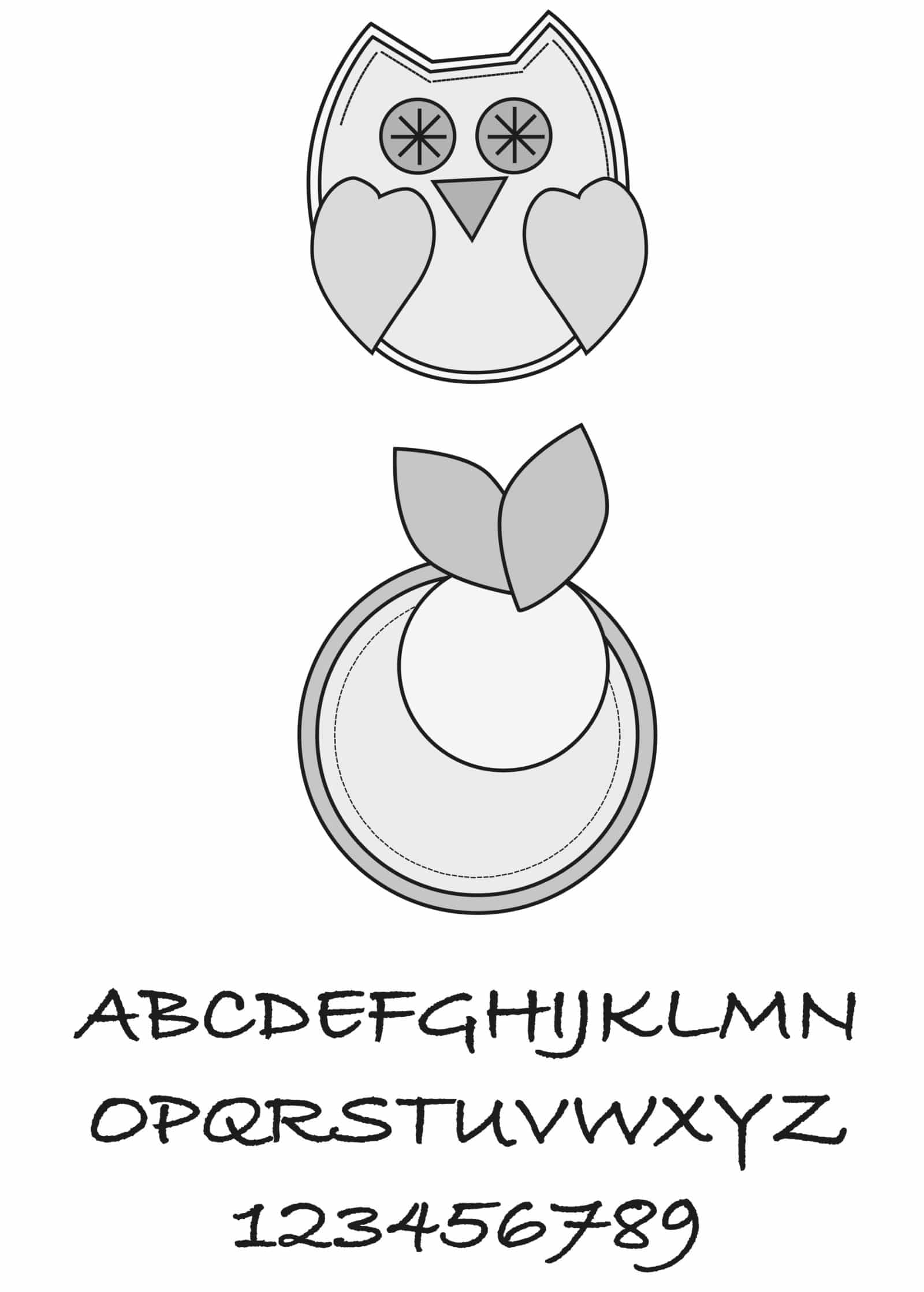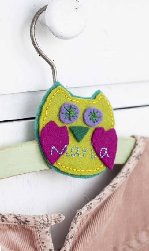 Alle Teile entsprechend der Vorlage aus buntem Filz zuschneiden. Die beiden Eulenformen mit Bastelkleber