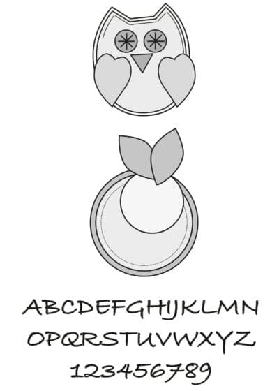 Schnabel und die Flügel aufkleben. Den Namen auf den Soluweb übertragen, auf der Eule fixiert und im Steppstich