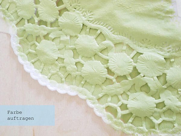Auf den folgenden Bilder könnt ihr sehen, wie das Ganze funktioniert. Viel muss ich zu den Bildern wohl nicht erklären, aber einen wichtigen Hinweis habe ich: Die Farbe sollte unbedingt auf die Schablone getupft werden, sonst läuft sie unter die Tortenspitze…