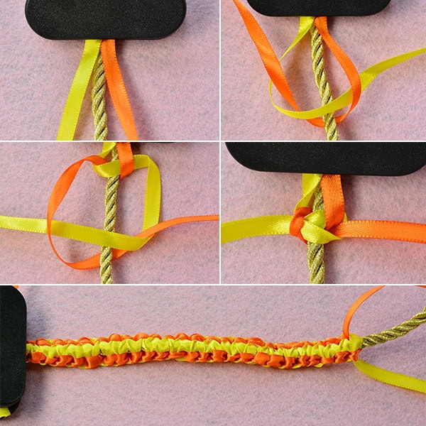2) Legen das orange Band unter dem Metallkordfäden und überqueren gelbe Band, in andere Wörte ist es Knoten.Wie das Bild zeigt.dann wiederholen die Schritte bis genau Länge.
