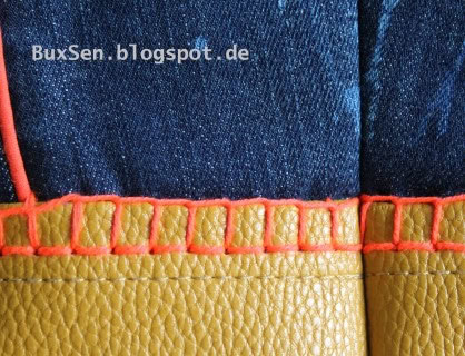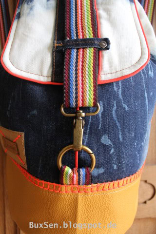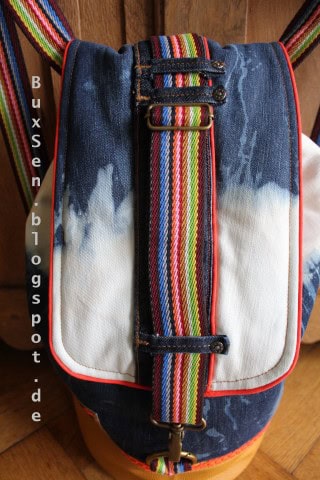 Den Hosenbund mit den Gürtelschlaufen habe ich als Gurtbandhalterung auf der Taschenklappe recycelt