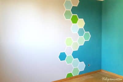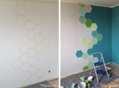 Ich habe als Hauptfarben für die Wände Grau und Petrol gewählt. Als Übergang zwischen den Farben habe ich mir ein Wabenmuster überlegt. Solche Grundformen in der Wiederholung können eine große Wirkung erzielen.