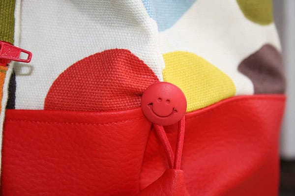 Meine Variante des Shoppers ist innen mit einem Staufach und einem zusätzlichen quadratischen, separaten Reißverschlusstäschlein, welches man mit Hilfe eines Karabiners ein- oder aushängen kann (je nach Lust und Laune eben!), ausgestattet. Persönliche Highlights sind für mich auf jeden Fall die Smiley-Knöpfe an den Seiten – damit wirklich keine schlechte Laune aufkommt!