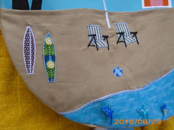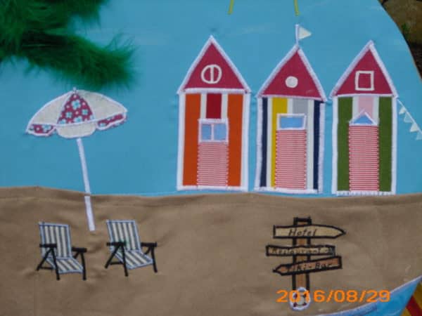 Nach langem Hin- und Her habe ich mich doch entschlossen, eine Strandtasche zu nähen und hier vorzustellen. Es wurde eine Strandszene, gestaltet aus Textilleder, Baumwollstoff, applizierten Stoffresten, Federn, Stoffmalfarbe und aufgenähtem Tüddelkram. Für das Innenleben habe ich den blauen „Meeresstoff“ verwendet.