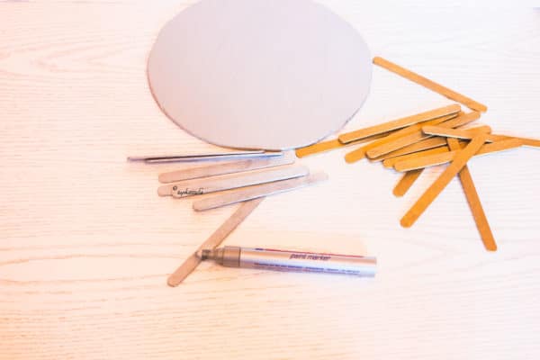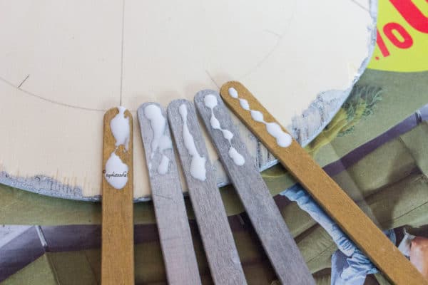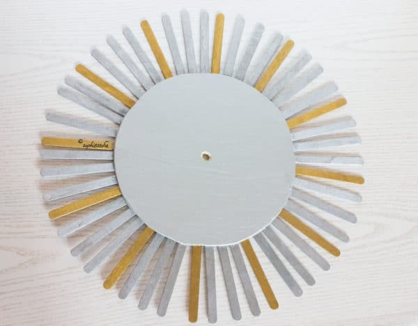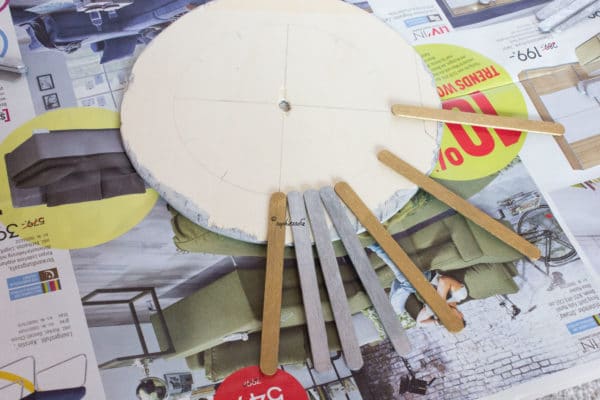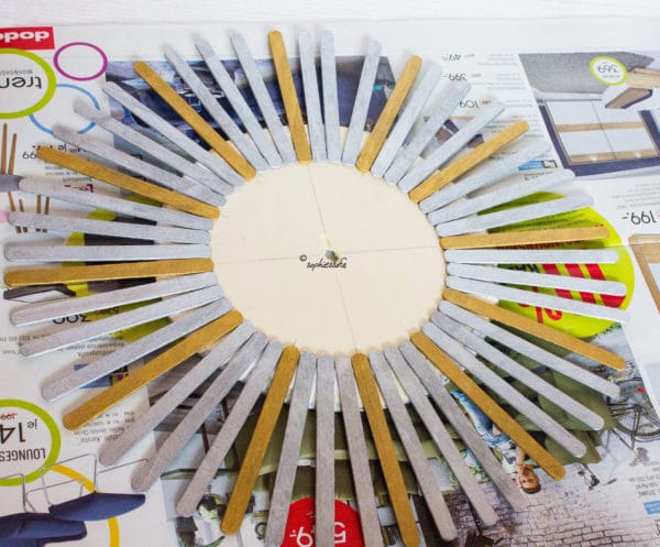 - Jetzt braucht ihr wieder die Eisstiele und die Holzscheibe. Die Eisstiele werden jetzt nämlich aufgeklebt. Bei jedem Strich kommt ein goldener Eisstiel, dazwischen je 3 silberne. Die Stiele klebt ihr mit dem Holzleim so auf, dass sie mit der oberen Kante an den Kreis mit dem Radius von 8 cm „stoßen“.