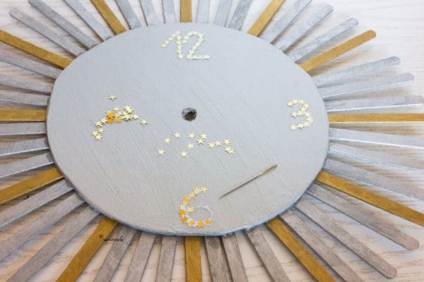 - Weil ich nicht jede Zahl auf dem Zifferblatt haben wollte, habe ich es auf 12, 3, 6 und 9 reduziert, trotzdem kann man ja dank der goldenen Eisstiele jede Stunde genau ablesen. Zum Anheben der Sternchen habe ich übrigens als Hilfe eine Nadel benutzt, damit ich nicht auf den Kleber fassen muss und damit ich garantiert nur einen Stern zu fassen habe.
