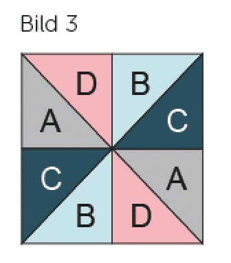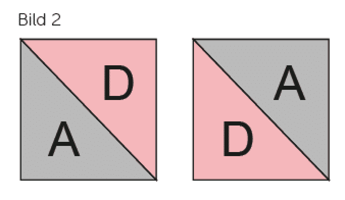 Auf der Rückseite eines Quadrats A eine Diagonale markieren. Das Quadrat A rechts auf rechts auf ein Quadrat D legen. Beidseitig der Markierung mit einer Nahtzugabe von 0,75 cm zusammennähen. (Bild 1) Entlang der Markierung durchschneiden. Es entstehen 2 Dreiecksquadrate A/D (Bild 2). Naht zum dunkleren Stoff hin bügeln. Diesen Schritt mit den Quadraten B und C wiederholen.