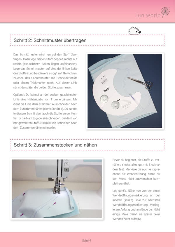 Die Anleitung besteht aus 7 bebilderten Seiten. Das Schnittmuster befindet sich auf zwei zusätzlichen A4-Seiten und muss entsprechend zusammengeklebt werden.