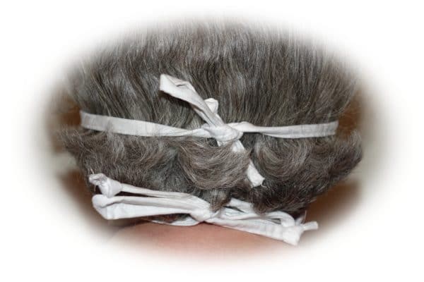 Bindebeänder deshalb, weil mir das Schlüpfergummi zu breit ist, und zu stramm . Wunde Stellen hinter dem Ohr und Druckstellen wegen geknotetem Gummiband sind mir zu riskant.