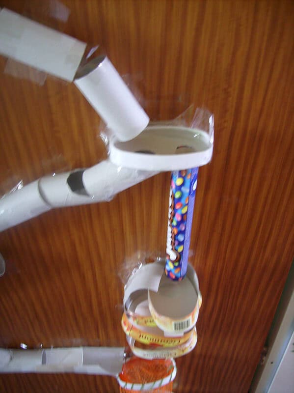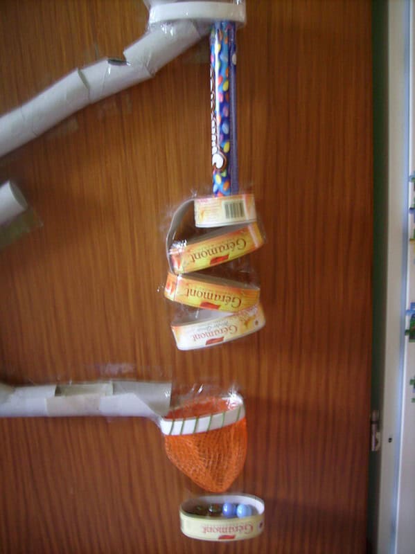 Es war Sonntag, es regnete… und unser alte Murmelbahn musste durch eine Neue ersetzt werden.. so entstand die Murmelbahn an seiner Zimmertür, mit einer Menge Tesafilm!!