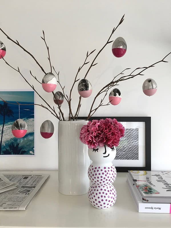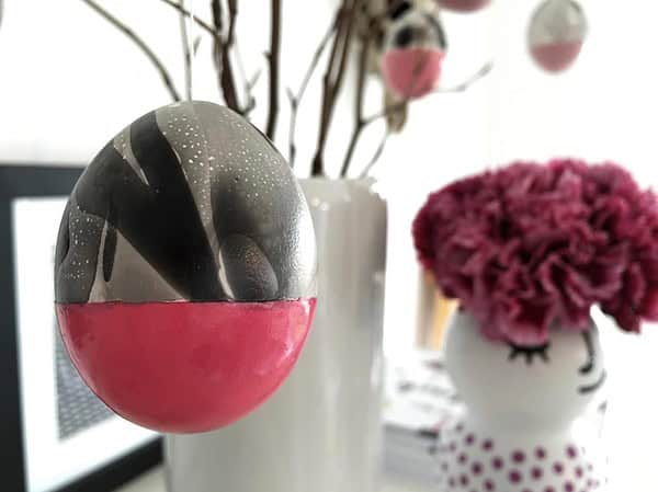 Mit Nagellack zur Hälfte lackieren, trocknen lassen und dann die andere Hälfte der ausgeblasenen Hühnereier mit Nagellack marmorieren. Was meint ihr? Gefällt euch mein neues Ostereidesign?
