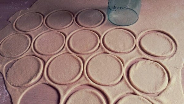 Mit einem Glas Kreise ausstechen. Die Kreise umdrehen, so dass sie auf der anderen Seite liegen. Das machen wir, damit sie nicht an der Arbeitsplatte festkleben.