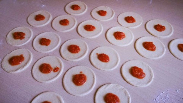 In die Mitte mit einem TL einen Klecks Sauce geben, einklappen, und mit der Gabel festdrücken, damit nichts von der Flüssigkeit rausläuft.