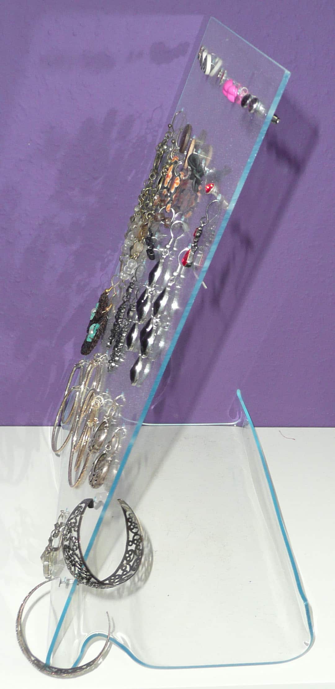 In die Plexiglasscheibe (noch mit Schutzfolien) Löcher bohren, die in Anzahl und Entfernung zueinander an die eigene Ohrring-Sammlung angepasst sind. Mit wenig Druck und geringen Drehzahlen arbeiten um Risse und das Schmelzen des Plexiglas zu vermeiden.