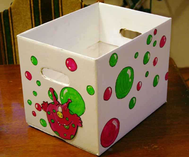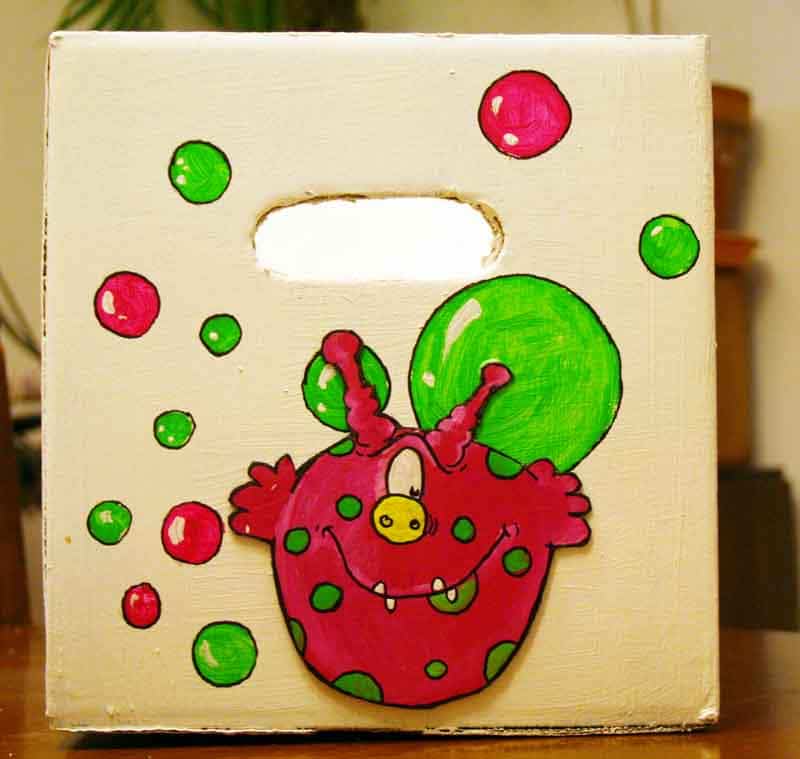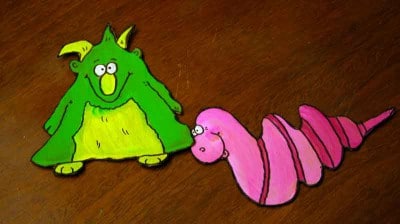Das Monster auf meinem Karton habe ich in einem Kinderbuch gefunden und fand es lustig. Also habe ich das Monster auf ein Stück Karton gezeichnet, ausgemalt, ausgeschnitten und mit einem Edding umrandet.