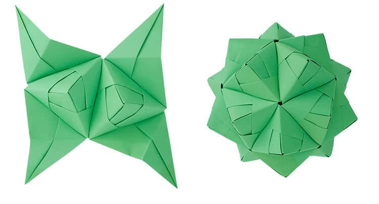 Bereits 1960 Entwickelte Mitsunobu Sonobe diese Falttechnik: Aus vielen gefalteten Papierquadraten lassen sich auf diese Weise fantastische 3-D-Objekte bauen.