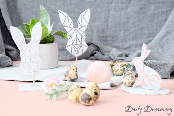 Meine geometrischen Osterhasen sind eine schlichte, moderne und auf’s Wesentliche reduzierte Osterdeko. Und mit lufttrocknender Modelliermasse und meinem Printable als Vorlage wirst du im Handumdrehen zum Bildhauer deiner Hasenskulpturen.