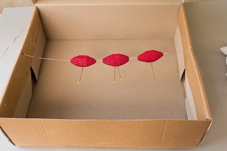 Damit überall Luft rankommt, zieht die Perlen auf einen Draht und hängt die "Leine" z.B. in eine Schuhschachtel.