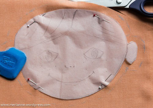 Kopf auf ein Papier zeichnen, ausschneiden. Den Stoff doppelt legen, die Vorlage mit den Stecknadeln festpinnen und den Kopf mit 1 cm Nahtzugabe ausschneiden.