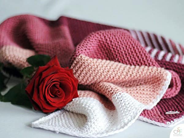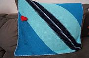 Eine schlichte, klassische Babydecke, die sich mit vielerlei Garnen umsetzten läßt. In diesem Fall wurde eine Mischung aus Baumwolle, Leinen und Brennnessel verwendet. Sie besteht aus einzelnen, farbigen Blöcken und endet mit einem Streifenmuster. Gestrickt wird von einer Spitze zur anderen, die Form entsteht dabei durch Zu- und Abnahmen.