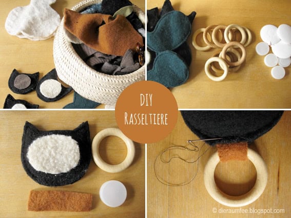 Aus dem Wollfilz zwei identische Tierkopfsilhouetten ausschneiden (Katze, Hund, Bär, etc) + ein Oval für das Gesicht in einer anderen Farbe.
