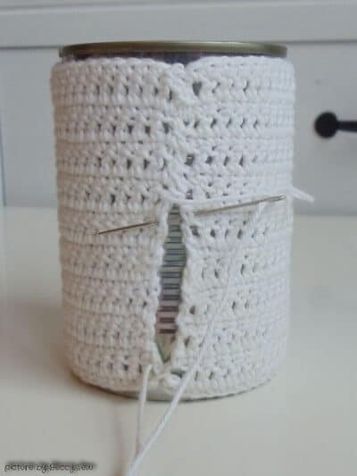 Meine Version ist recht simpel: Die Hinreihe besteht jeweils aus festen Maschen, die Rückreihe jeweils aus einfachen Stäbchen, so dass man in den Lücken der Stäbchenreihen noch ein klein wenig die Dose darunter erahnen kann.