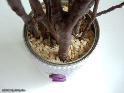 Füllt die Dose mit Reis (oder Kieselsteinchen, Erbsen, Linsen, …) und steckt die Ästchen und Stöckchen dann hinein; so könnt ihr sie schön zu einem Strauß arrangieren.