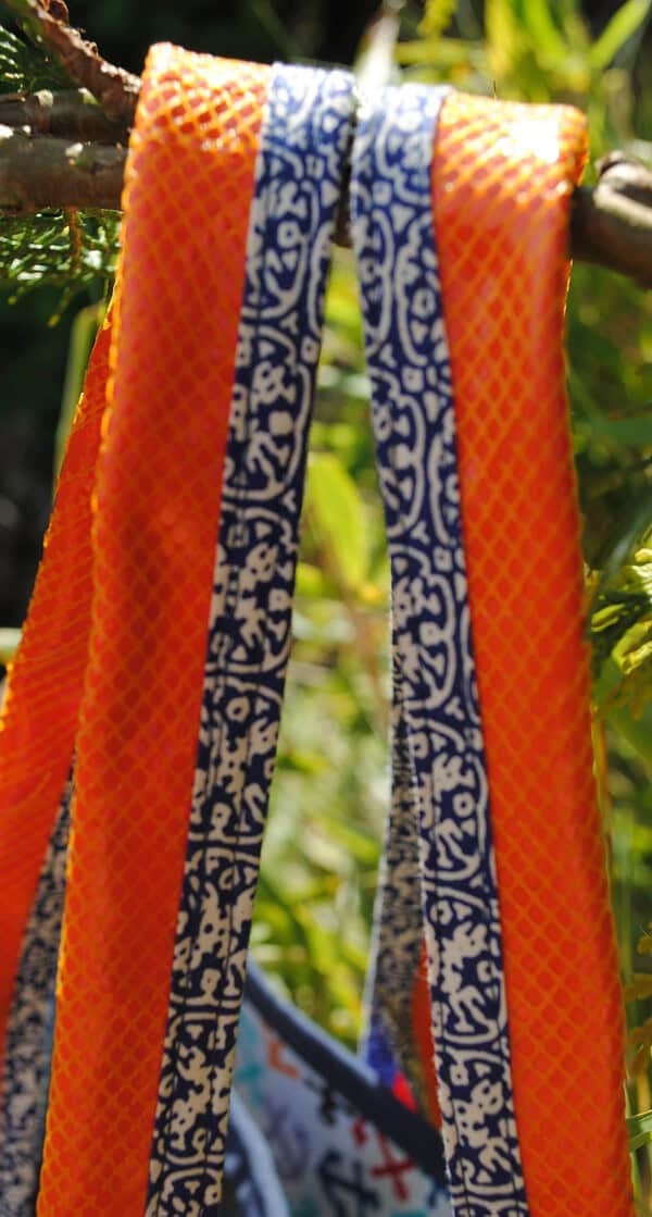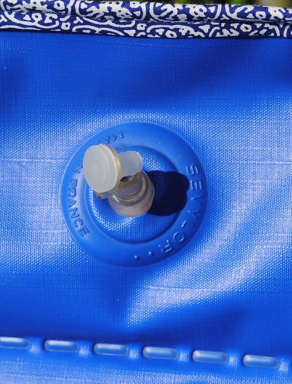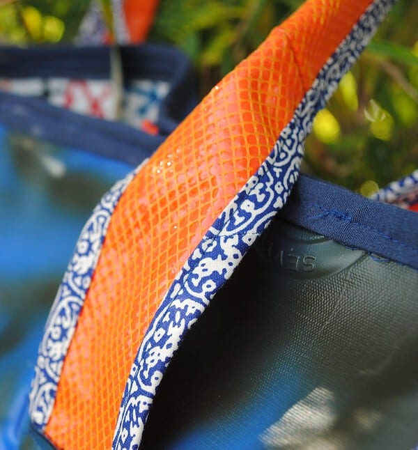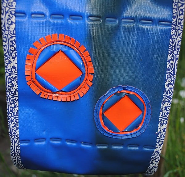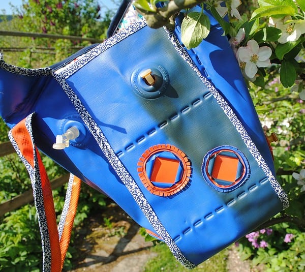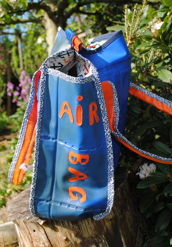 Ich wurde fündig. Eine alte Luftmatratze mußte dran glauben, zerschnippelt zu werden. So mit und mit wuchs meine „Air Bag“. Ich muß sagen, es war nicht ganz so einfach, das „steiffe-sperrige“ Material zu nähen, aber ich konnte es bezwingen. Die Taschenhenkel habe ich aus der Luftmatratze und einem Kartoffelnetz hergestellt. Hier habe ich das verschmelzen eingesetzt. Die Optik gefällt mir sehr. Ein Hingucker bei der Tasche sind auch die vorhandenen Lufteinfüllstöpsel von der Luftmatratze sowie die “ Verschweißungen“ (die schon vorhanden waren), die aus sehen wie große Nähte.