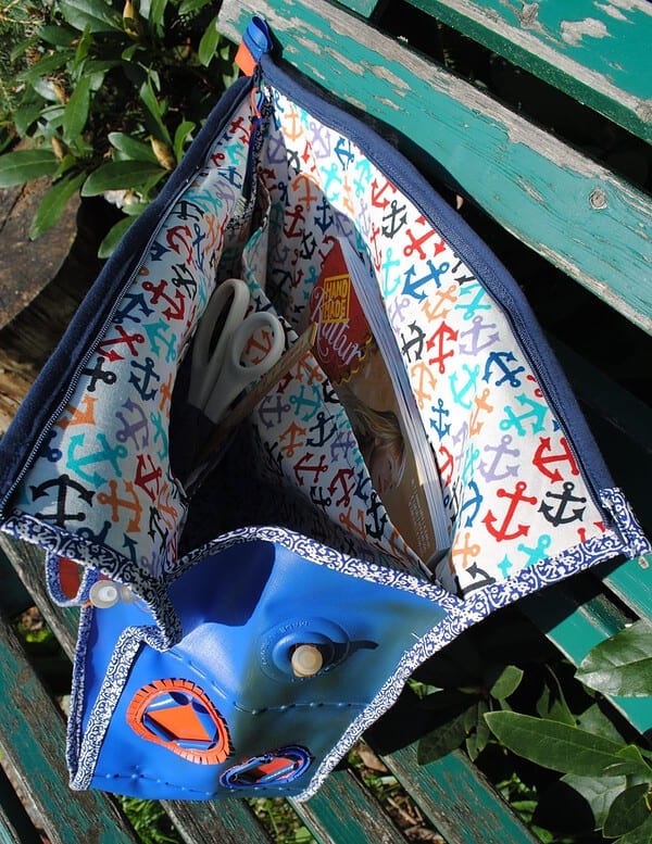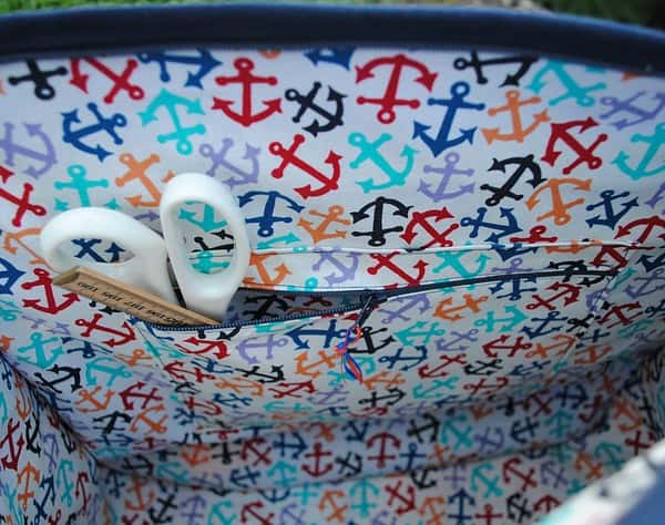 Das Innenleben der Tasche ist aus einem bunten Baumwollstoff genäht. Die große Innentasche und die kleine Seitentasche mit Reißverschluß sind praktisch, um ein bisschen Ordnung zu halten.