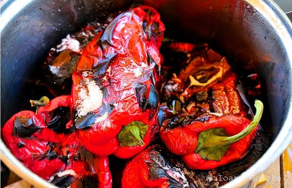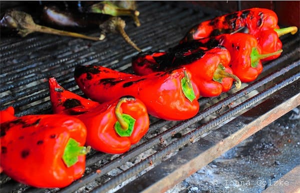 Die Spitzpaprika wird gewaschen und gegrillt (oder im Backofen auf ein mit Backpapier belegtes Blech gebacken) und dabei mehrmals gewendet. Die Haut soll - zumindest stellenweise - schwarz werden und platzen, die Paprikaschoten sollen weich sein. Dann werden die ganzen Paprikaschoten in eine Schüssel gelegt, ordentlich mit Salz bestreut und eine halbe Stunde liegen gelassen. Das Salz hilft dabei, dass die Haut sich leichter pellen lässt. Anschließend die Haut pellen, der Stiel bleibt dran.