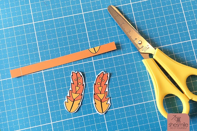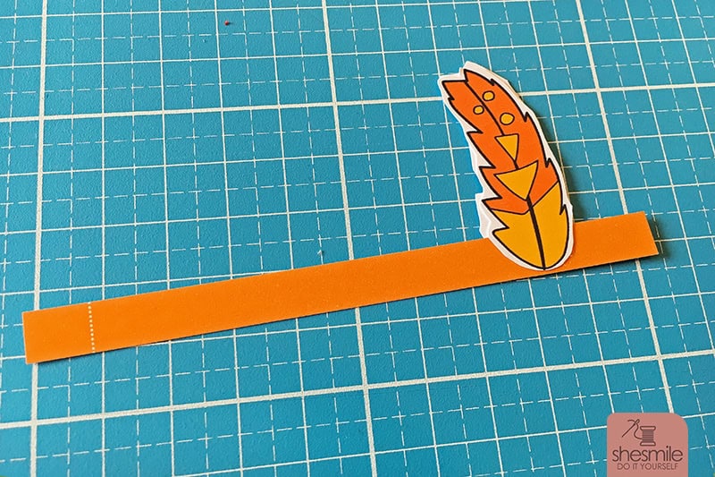 Die Federn in doppelter Lage mit Flüssigkleber an der vorgedruckten Markierung auf das Band kleben.
