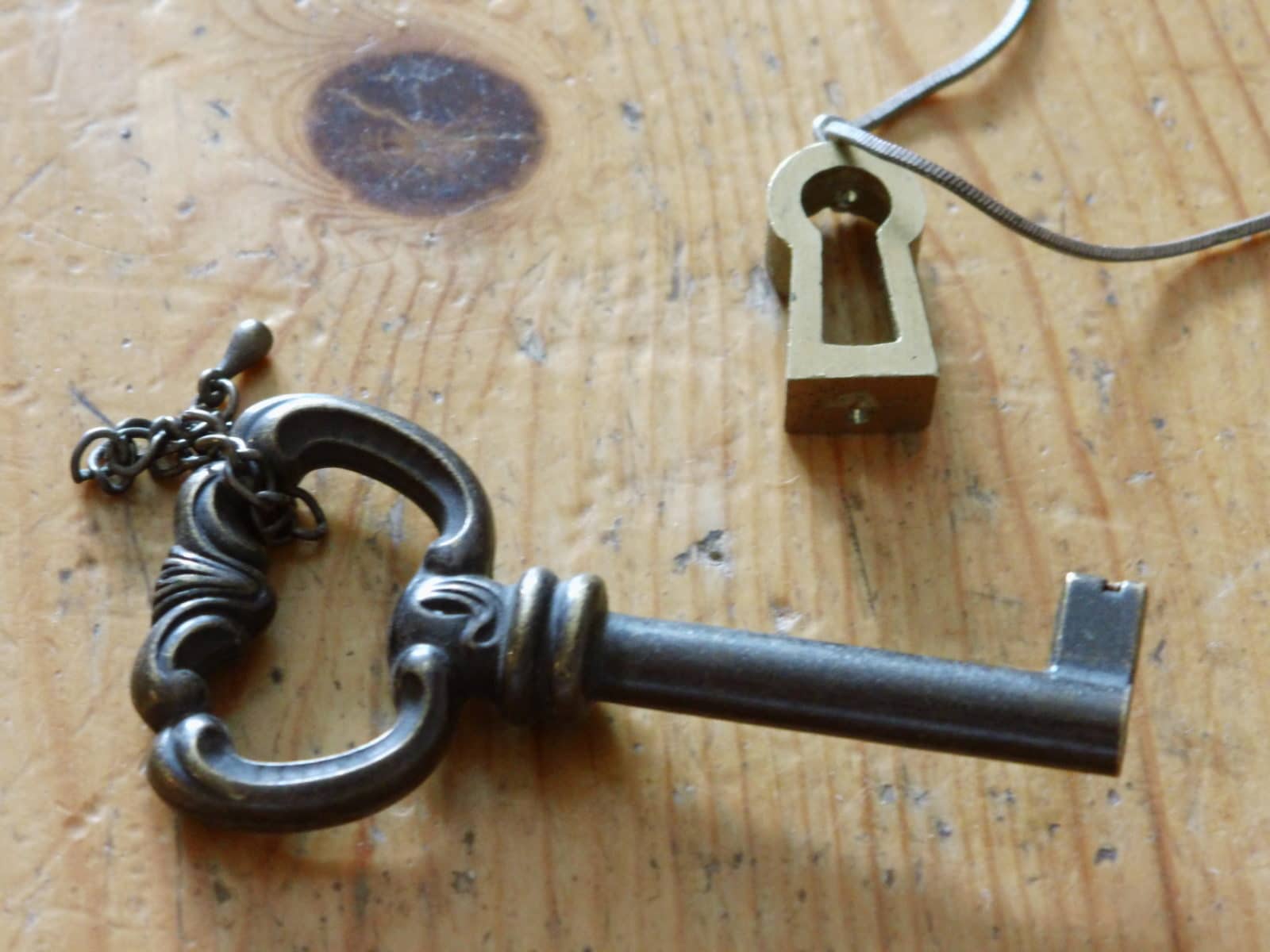 Die meisten Schlüssellöcher haben zusätzlich zu dem Schlüsselloch noch ein kleines Loch für eine Schraube o.ä. Dort hinein kommt der Ohrsteckerrohling und kommt oben wieder heraus. Das obere Ende biege man mit einer Rundzange um, sodass man eine Öse hat. Durch diese kommt die kürzere Halskette.